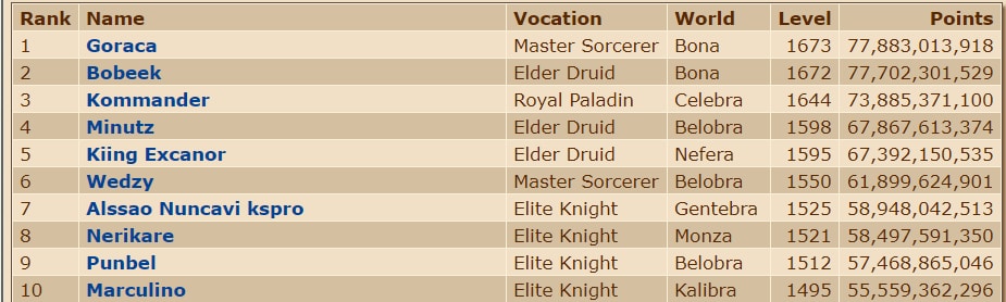 No momento, a diferença entre os personagens do casal é de apenas 2 levels, o que corresponde a cerca de 230 milhões de experiência. Goraca está atualmente no level 1673 e Bobeek no level 1671. Kommander, o jogador brasileiro mais bem posicionado da lista aparece logo em seguida com o level 1644.