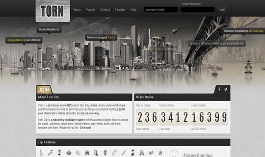 Com mais de 2 milhões de jogadores registrados e quase 30 mil jogadores ativos diariamente, “Torn” permite ao jogador começar uma nova vida virtual e construir seu império criminal do zero realizando tarefas para o crime organizado. No entanto, também é possível ganhar dinheiro no jogo realizando trabalhos legítimos como montar seu próprio negócio.