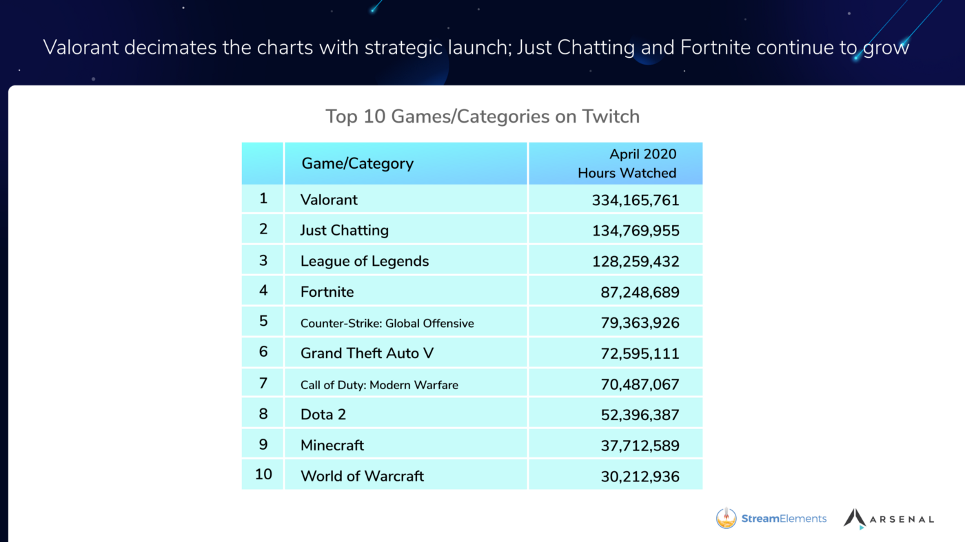 De acordo com dados do StreamElements e Arsenal.gg, esse número é três vezes a quantidade de tempo gasto em League of Legends, e quase quatro vezes a quantidade de tempo gasto assistindo Fortnite. Isso não quer dizer necessariamente que o battle royale da Epic Games tenha perdido espaço no Twitch, pelo contrário. Fortnite registrou crescimento contínuo em horas assistidas na plataforma desde o início de janeiro deste ano.