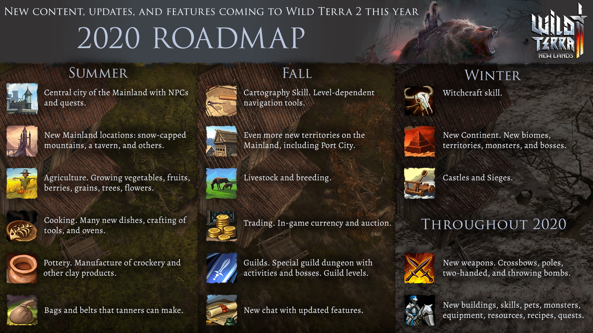 A Juvty Worlds revelou o roteiro de desenvolvimento de Wild Terra 2: New Lands, sequência de Wild Terra Online centrada mais nos aspectos MMORPG. Não foram revelados muitos detalhes, mas podemos esperar por uma “Cidade Central”, novas áreas de caça, sistema de agricultura, sistema de culinária e artesanato, cartografia e habilidades de navegação, pecuária e criação de animais, comércio e leilão.