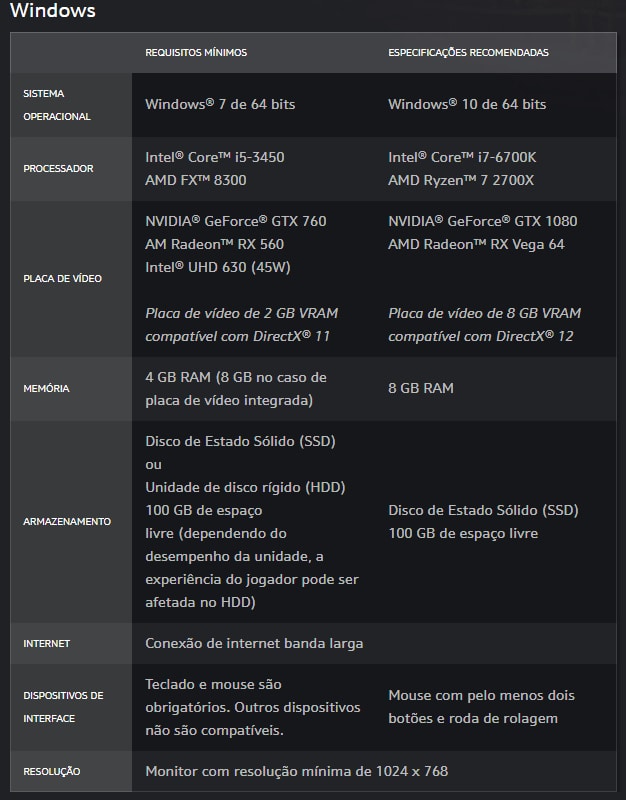 Para jogar nas configurações mínimas, os jogadores precisarão que sua máquina esteja equipada com um processador Intel Core i5-3450 ou AMD FX 8300, uma placa de vídeo NVIDIA GeForce GTX 760, AMD Radeon RX 650 ou Intel UHD 630 (45W). Além disso será necessário uma memória RAM de 4GB (ou 8GB no caso de placa de vídeo integrada) e um HDD ou SSD com 100GB de espaço livre.