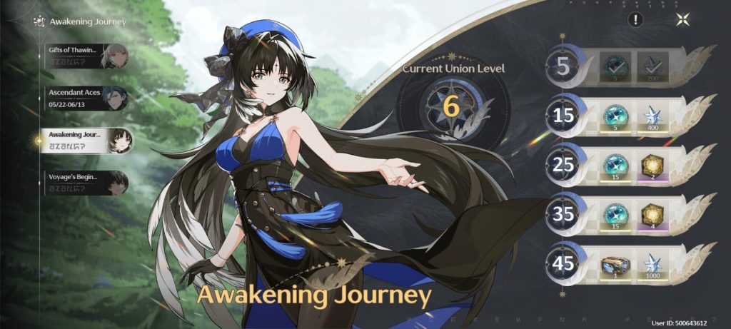 Já a Awakening Journey é um evento contínuo que oferece incentivo adicional para os jogadores aumentarem seu Nível de Union. Ao subir de nível de Union para 5, 15, 25, 35 e 45, o jogador será recompensado com itens como Lustrous Tides, Astrites, Crystal Solvent, e uma Arma de 5 estrelas à da série Winter Brume. Enfim, é um evento que você eventualmente consegue desbloquear as recompensas eventualmente ao progredir no jogo. Lembrando quanto mais alto o seu Nível de Union, mais recompensas tentadores são possíveis de serem resgatadas.