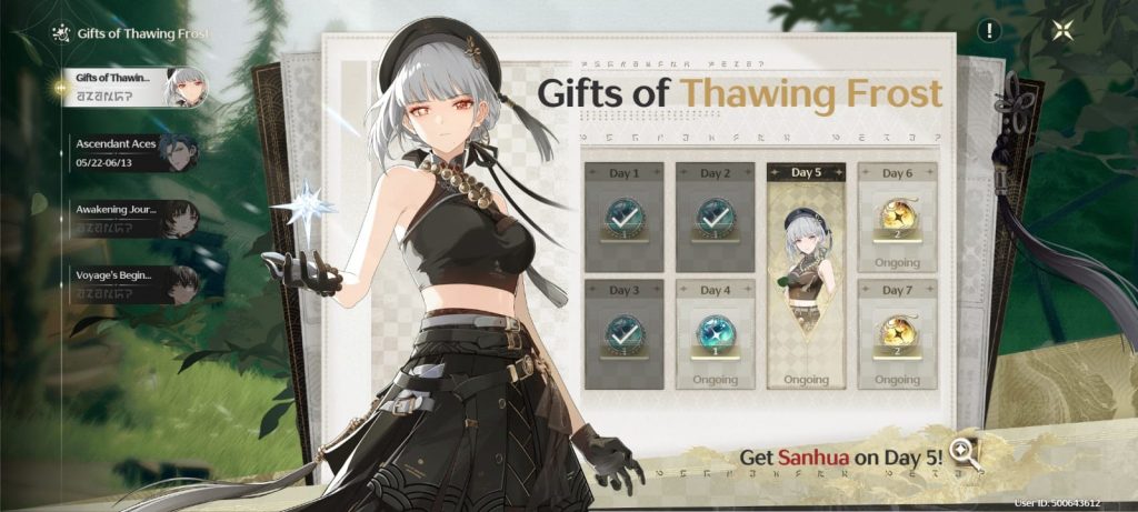 Gifts of Thawing Frost é um evento contínuo projetado para recompensas os jogadores dedicados com tesouros tentadores simplesmente por marcarem presença regularmente no jogo. Ao se conectar no jogo diariamente, o jogador pode ser recompensado com os Lustrous Tides e Radiant Tides, que são necessárias para invocar alguns banners e Armas. Além disso, ao comparecer consecutivamente ao jogo pelo período de cinco dias, o jogador é recompensado com o Resonator de 4 estrelas Sanhua. Isto é, quanto mais vezes você se conectar ao jogo, ainda mais de maneira consecutiva, você será recompensado com tesouros ainda melhores.