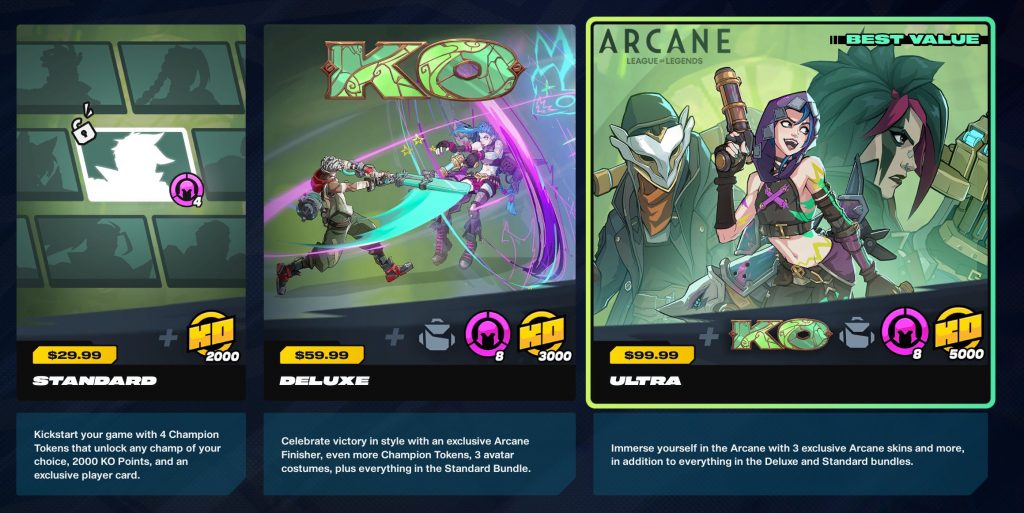 Além da versão mais cara, há outras opções disponíveis: o pacote Padrão, que custa cerca de R$ 120 e oferece 2.000 moedas virtuais e quatro emblemas de campeão, e o Deluxe, de aproximadamente R$ 240, que inclui oito emblemas, um finalizador exclusivo e 3.000 moedas — ambos, no entanto, sem as cobiçadas skins de Arcane. 2XKO está disponível gratuitamente no PC.